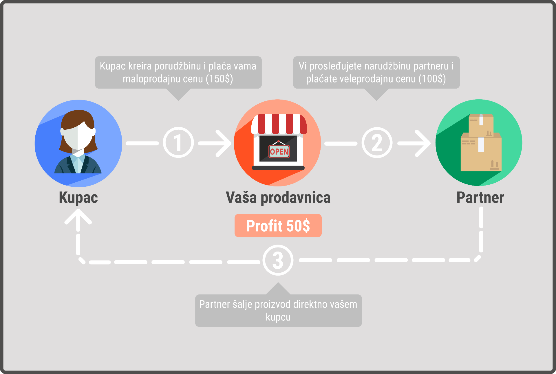- Partner šalje paketa i isporučuje narudžbinu direktno kupcu u vaše ime.